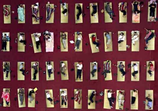 Parents of the freshmen at a university in Wuhan, in central China's Hubei province, rest inside a gym centre Monday. The university lay out 350 mattresses for the visiting parents, who accompanied their children from a distant city to help them settle in. Hotel rooms near the university were fully booked.