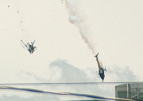 The helicopters were tracking a police chase through the streets of downtown Phoenix when they collided at midday Friday, crashing to the ground in flames and heavy smoke.