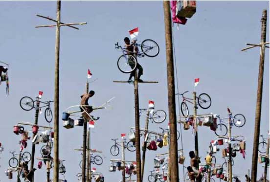 Indonesian men climb greased poles to retrieve prizes such as bicycles and rice cookers as part of an Independence Day celebration Friday in Jakarta, Indonesia. Indonesians are celebrating the 62nd anniversary of Independence from Dutch colonial rule.
