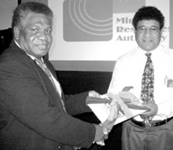 Mr Moaina (left) handing over the MRA corporate plan to Mr Pala at the Holiday Inn Ballroom last Friday night.