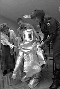 Fire officials dress a schoolchild in a firefighter's outfit as part of a safety lesson in Stavropol.