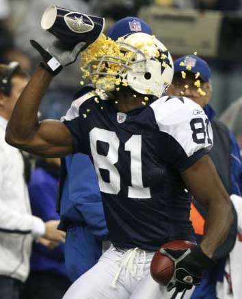 Dallas Cowboys wide receiver Terrell Owens celebrates a touchdown catch   back to the line pole
