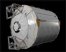 An artist's depiction of the exterior of the Columbus laboratory. The European-built module will host a number of experiments, both inside and outside the space station. (NASA)